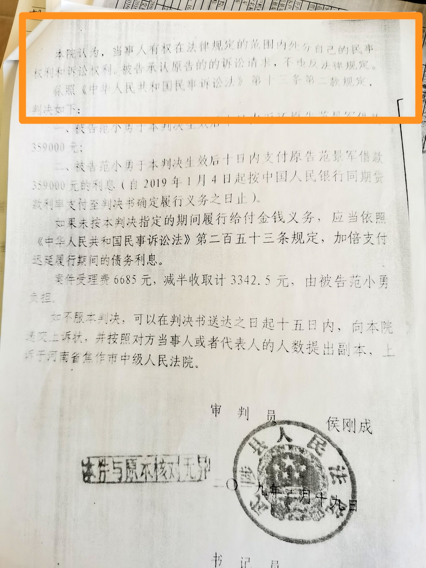 2019年2月19日,武陟县人民法院作出民事判决书,判决范小勇归还范景军借款35.9万元及利息。