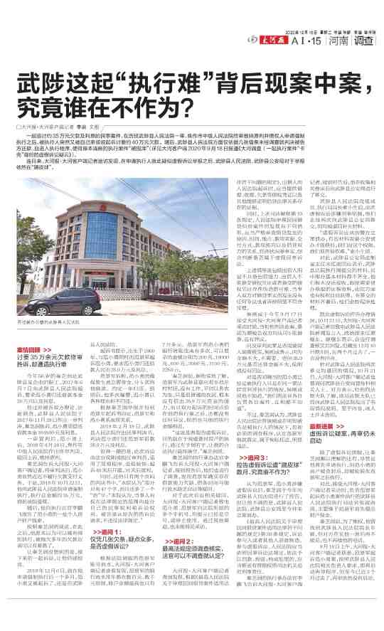 一起追讨约35万元欠款及利息的民事案件,在历经武陟县人民法院一审、焦作市中级人民法院终审维持原判并债权人申请强制执行之后,被执行人突然又被自己亲叔叔起诉讨要约40万元欠款。随后,武陟县人民法院方面仅依据几张借条未经调查就判决被告方还款,且进入执行程序,使得原本清晰的执行案件“被搅浑”(详见大河客户端2020年9月18日报道《大河调查|一起执行案件“卡壳”背后的虚假诉讼疑云》、2020年12月11日顶端新闻报道《大河调查|武陟一起“执行难”背后现案中案,谁在不作为?》、2020年12月15日大河报AI·15 版《武陟这起“执行难”背后现案中案,究竟谁在不作为?》)。
