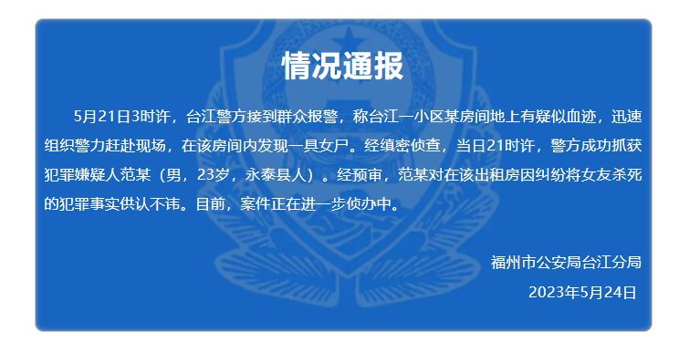 据福州台江公安微信公众号通报,5月21日3时许,台江警方接到群众报警,称台江一小区某房间地上有疑似血迹,迅速组织警力赶赴现场,在该房间内发现一具女尸。经缜密侦查,当日21时许,警方成功抓获犯罪嫌疑人范某(男,23岁,永泰县人)。经预审,范某对在该出租房因纠纷将女友杀死的犯罪事实供认不讳。目前,案件正在进一步侦办中。