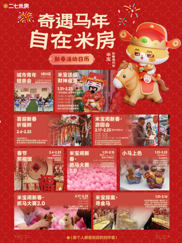 在二七,藏着两处由城市旧迹焕新的创意天地——瑞光创意工厂与二七米房,一园文艺馥郁,一街潮流鲜活。瑞光创意工厂文创园年货市集将于即日起至2月8日的每周六、周日热闹开市,50+手工年货涵盖原创文创、非遗手作、马年周边、中古好物等,还有现场写春联、做糖画等特色活动及互动游戏,年味十足又富创意。二七米房“米宝闹新春”游园会将在1月30日-2月18日举办,探案寻金马、财神巡游、抓“马”趣味活动以及“爱你老己·2026马年TO签”活动为你带来欢乐祥和的节日氛围;2月4日-2月14日,米宝IP人偶现场邀请游园情侣参与互动问答,米宝声音告白馆可现场录制对亲友的新春祝福、个人新年心愿等音频,用美好祝愿开启新的一年。