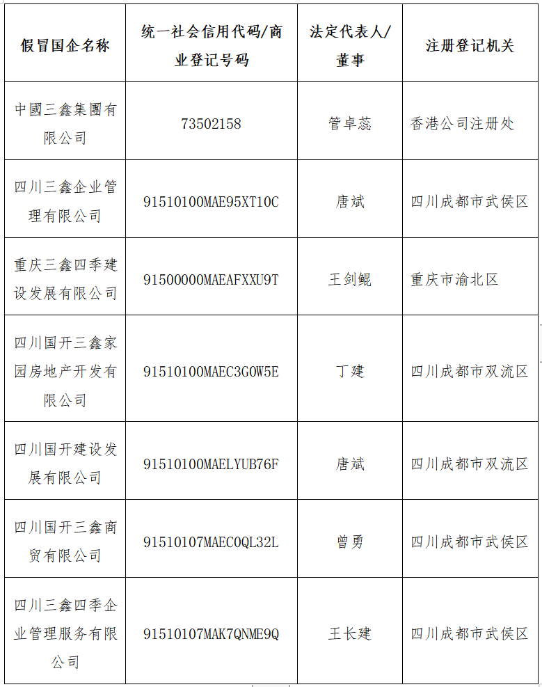 近期,经国家开发投资集团核实,发现中國三鑫集團有限公司系通过提供伪造文件及/或虚假信息等方式,注册登记为国家开发投资集团下属企业,中國三鑫集團有限公司及其在境内外投资的各级子企业(部分企业情况见下表)均为假冒国企,与国家开发投资集团及关联企业无任何隶属或股权关系,也不存在任何投资、合作、业务等关系,其一切行为均与国家开发投资集团无关。