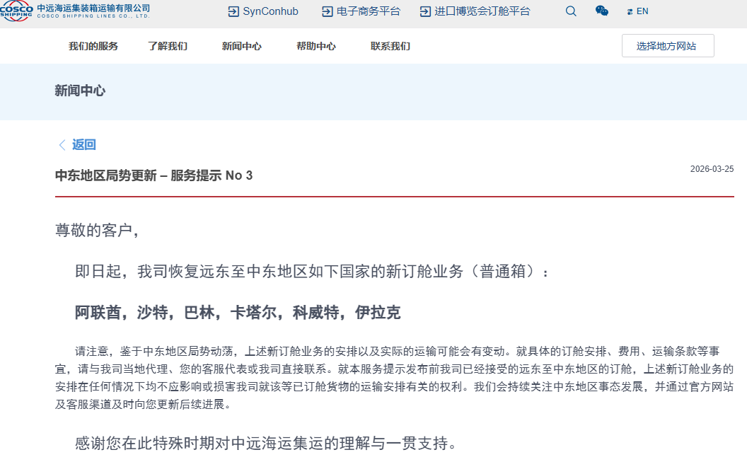 中远海运集运:恢复至阿联酋、沙特等中东地区新订...