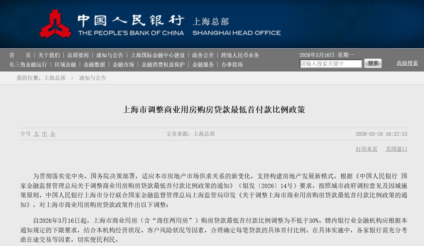 上海楼市新政!商业用房首付降至30%...