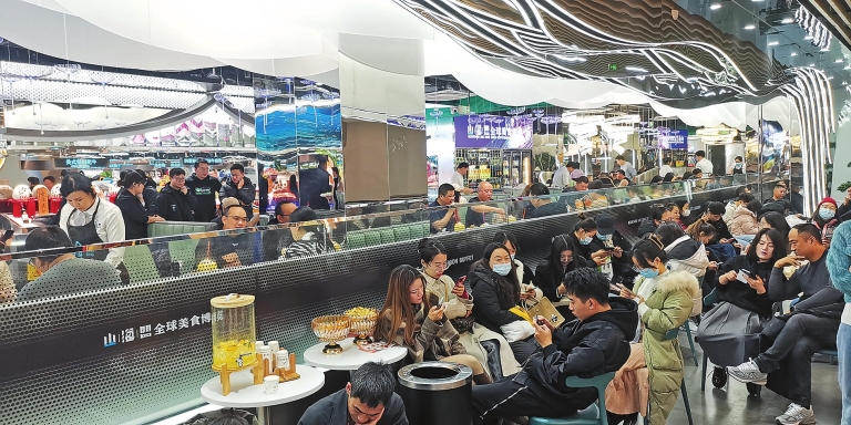 郑州二七万达广场负一层的山海盟店里,坐满了等待就餐的顾客。拍摄于12月5日下午3点