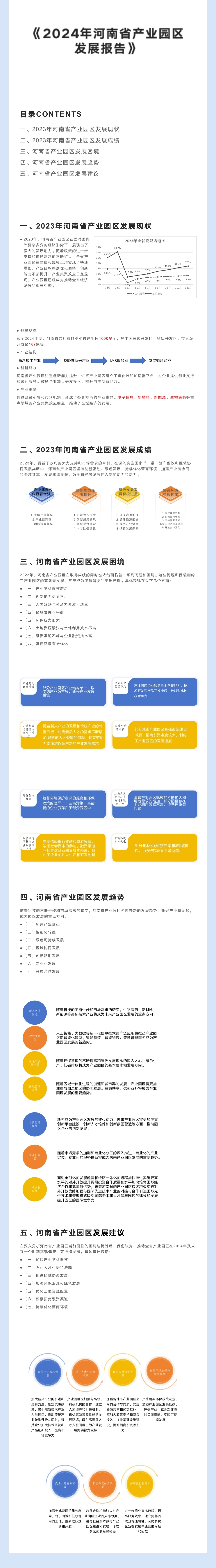报告指出,随着科技的不断进步和市场需求的转变,河南省产业园区将迎来新的发展趋势。具体体现为:新兴产业将崛起,成为园区发展的重点方向;智能化转型将加速,提升产业园区的发展水平;绿色可持续发展将成为基本要求,推动产业园区环保意识的提高;区域协同发展将加强,实现资源共享和优势互补;创新驱动发展将成为核心动力,推动园区企业创新发展;专业化发展将更加突出,提升产业园区的发展质量和竞争力;同时,开放合作发展将深化,提升园区的国际竞争力。