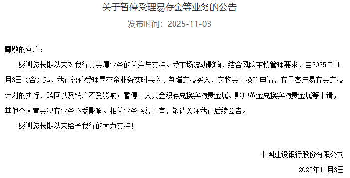 建设银行同日发布公告,自2025年11月3日(含)起,暂停受理易存金业务实时买入、新增定投买入、实物金兑换等申请,存量客户易存金定投计划的执行、赎回以及销户不受影响;暂停个人黄金积存兑换实物贵金属、账户黄金兑换实物贵金属等申请,其他个人黄金积存业务不受影响。