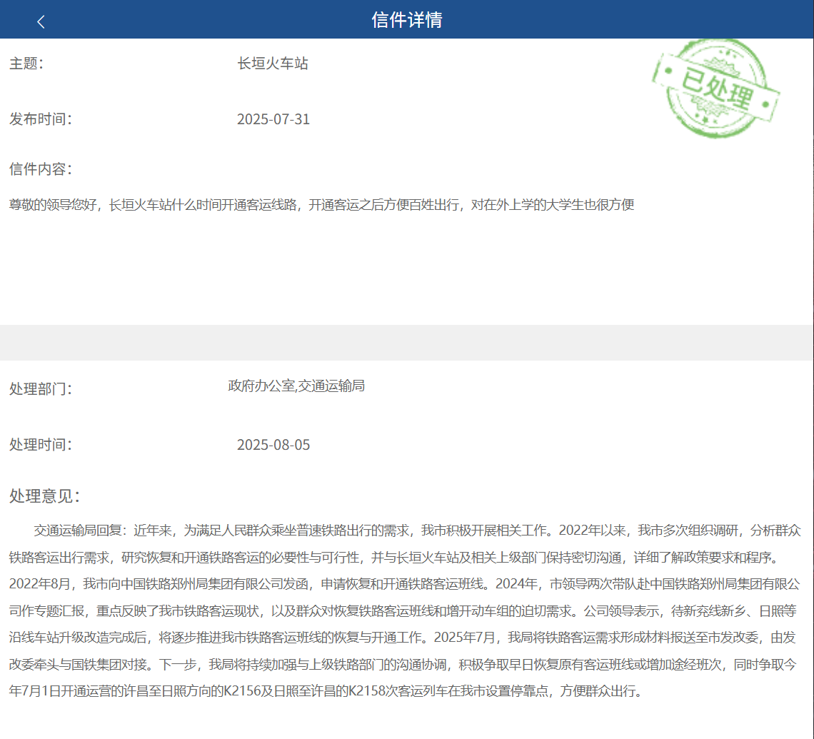 长垣市交通运输局回应称:近年来,为满足人民群众乘坐普速铁路出行的需求,2022年以来,我市多次组织调研,分析群众铁路客运出行需求,研究恢复和开通铁路客运的必要性与可行性,并与长垣火车站及相关上级部门保持密切沟通,详细了解政策要求和程序。2022年8月,我市向中国铁路郑州局集团有限公司发函,申请恢复和开通铁路客运班线。2024年,市领导两次带队赴中国铁路郑州局集团有限公司作专题汇报,重点反映了我市铁路客运现状,以及群众对恢复铁路客运班线和增开动车组的迫切需求。公司领导表示,待新兖线新乡、日照等沿线车站升级改造完成后,将逐步推进我市铁路客运班线的恢复与开通工作。2025年7月,我局将铁路客运需求形成材料报送至市发改委,由发改委牵头与国铁集团对接。下一步,我局将持续加强与上级铁路部门的沟通协调,积极争取早日恢复原有客运班线或增加途经班次,同时争取今年7月1日开通运营的许昌至日照方向的K2156及日照至许昌的K2158次客运列车在我市设置停靠点,方便群众出行。