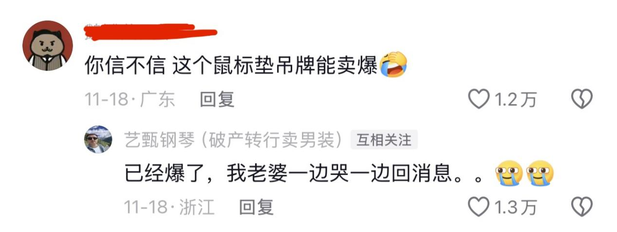 “超大鼠标垫吊牌”反响热烈,网友们对王先生这种“听劝”行为连连称赞。有网友评论表示“不管卖啥都高低买点儿”。王先生也在评论区表示“鼠标垫吊牌的衣服已经卖爆了,老婆一边哭一边回复消息。”