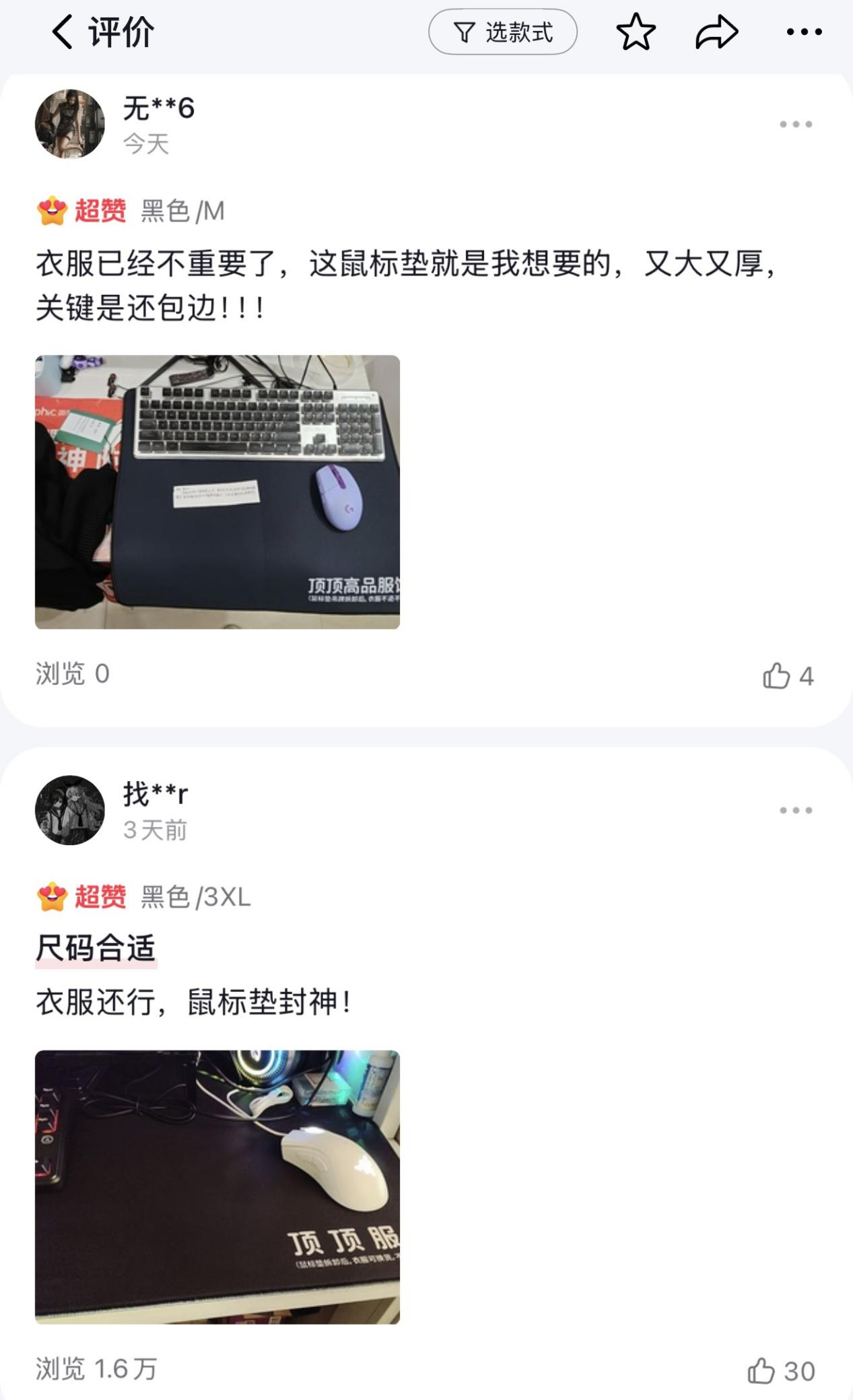 “第一批收到货的消费者反响还是非常好的,因为本身衣服质量也不差,再加上有鼠标垫的加持,几乎没有退货,也没有差评。”王先生告诉记者一个让他印象深刻的事情,“有个顾客买的裤子拉链可能有点小问题,像往常很多消费者就会申请仅退款之类的‘薅羊毛’,但是这位顾客就选择了退货退款,我也顺带着把鼠标垫送给他了,他后续又下了一单。”