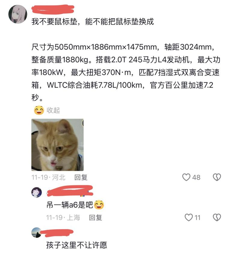 11月18日,王先生再发视频,相同的内容,相同的文案,只不过这次吊牌已经换成了超大号鼠标垫。视频收获近16万点赞和1.8万条评论。至此,王先生账号的评论区变成了“许愿池”。