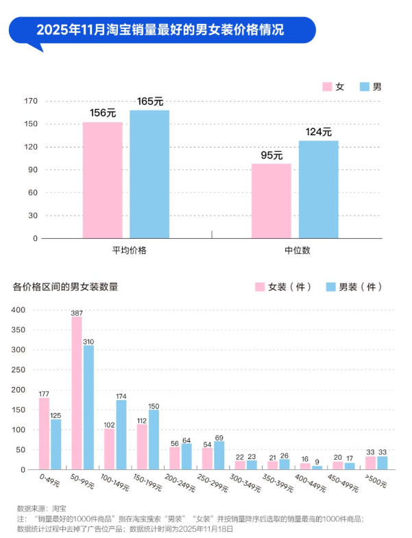 今年“双十一”期间,在淘宝上搜索“男装”并采集销量最高的1000件单品之后会发现,不管在均价还是价格中位数上,男装的价格均高于女装。“男人不愿意在衣服上花钱”已成“过去式”。