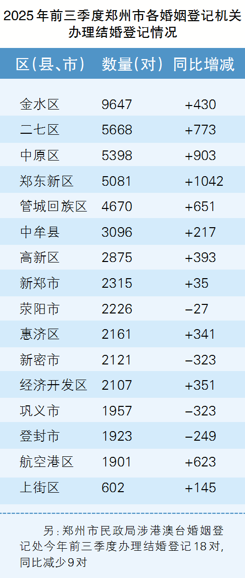 航空港区也表现亮眼,今年前三季度,1901对的结婚登记量较去年同期增加623 对,增势明显。