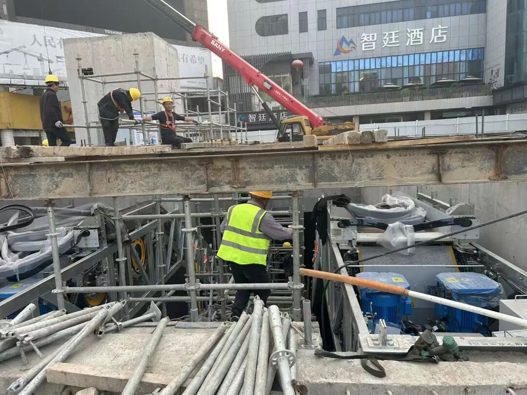 郑州火车站东西广场地下通道建设又有新进展——电梯安装作业已启动,这预示着开通运营进入倒计时。