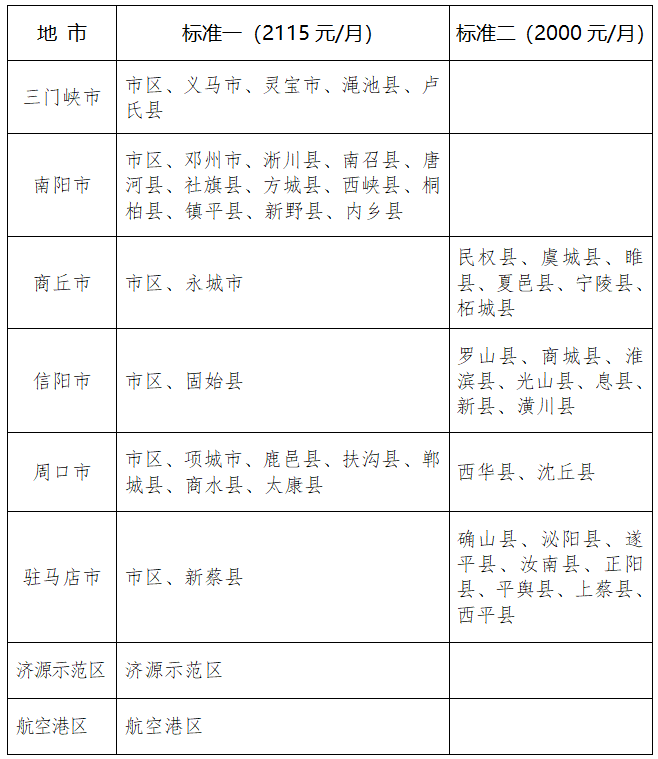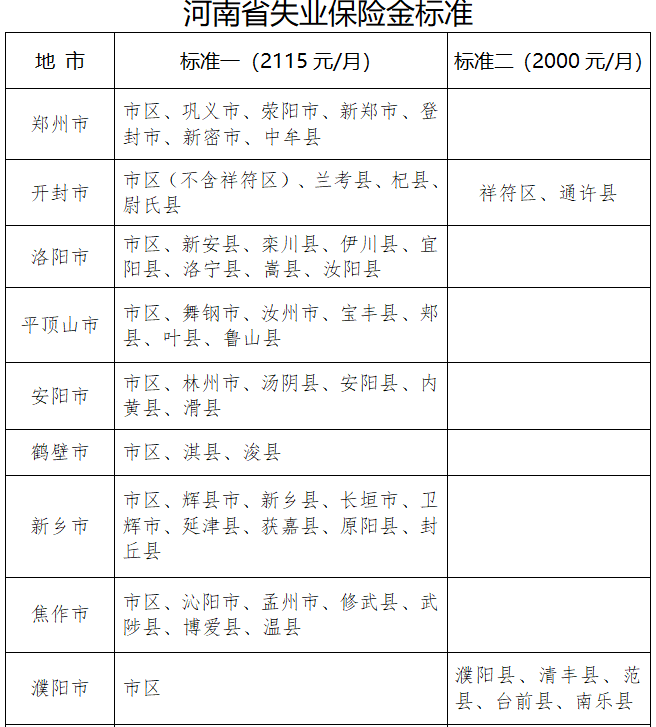 根据通知,失业保险金基本标准按照全省一类行政区域月最低工资标准的百分之九十确定,调整为2115元/月。其中,基本标准高于最低工资标准的三类行政区域,失业保险金标准按照不高于所在地最低工资标准确定,调整为2000元/月。纳入省直统筹的失业保险参保单位,失业保险金标准参照郑州市市区标准执行。调整标准所需资金由失业保险基金列支。