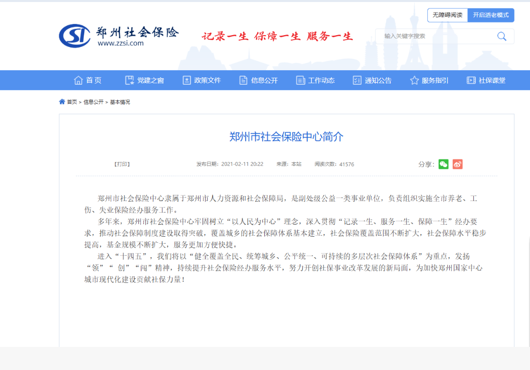 该网站信息还显示,郑州市社会保险中心隶属于郑州市人力资源和社会保障局,是副处级公益一类事业单位,负责组织实施全市养老、工伤、失业保险经办服务工作。