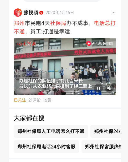 比如2020年4月16日媒体曾报道:郑州市民跑4天社保局办不成事,电话总打不通。