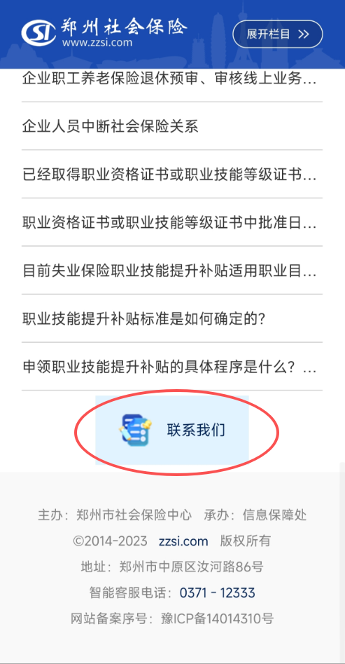 翻到该网站最下方有一个“联系我们”的按钮提示,点开后显示“办事大厅”“服务网点电话”两个界面。前者详细列举了郑州市本级和16个县(市、区)的办事大厅地址、电话。