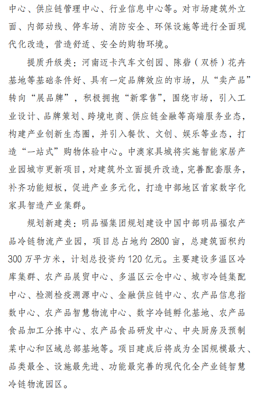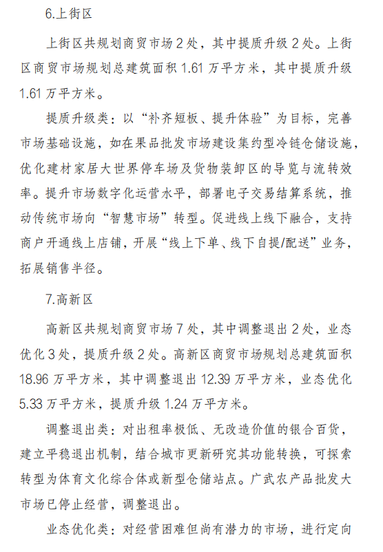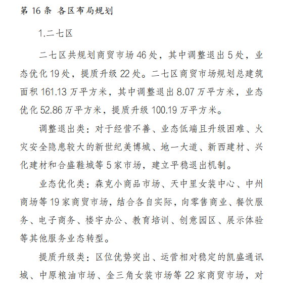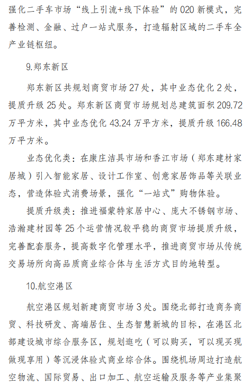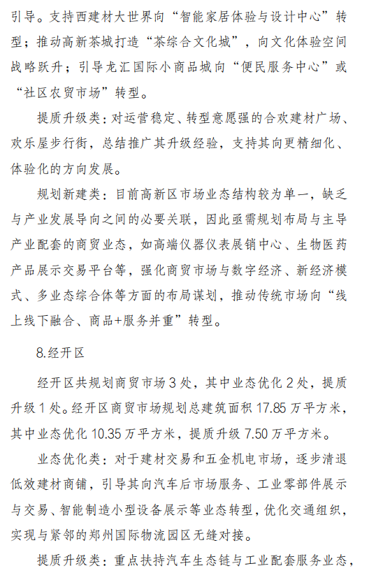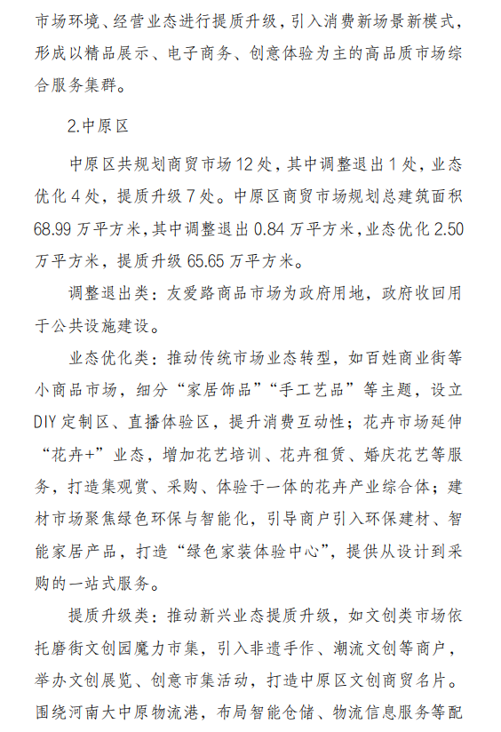 二七区、管城区重点推动火车站商圈等传统核心区业态升级与空间重构;金水区强化电子数码等特色商圈能级;郑东新区 引导大型家居建材市场向“展贸一体化”转型;中原区、高新区推动市场与主导产业配套协同;惠济区巩固提升冷链、花卉等专业集散功能;航空港区优先布局临空型商贸与供应链管理平台;上街区等远城区聚焦服务本地民生。