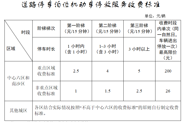 (三)区人民政府依法设置的道路停车泊位,按照“路内高于路外,城市中心区域高于外围区域、重点区域高于非重点区域、拥堵时段高于空闲时段”的原则,由市、区发展改革部门分别制定道路停车泊位使用费标准。其中,中心六区(指越秀区、海珠区、荔湾区、天河区、白云区、黄埔区,下同)和南沙区由市发展改革部门制定收费标准,其他城区(指花都区、番禺区、从化区、增城区,下同)由所在区发展改革部门按照“不高于中心六区收费标准”的原则制定收费标准。