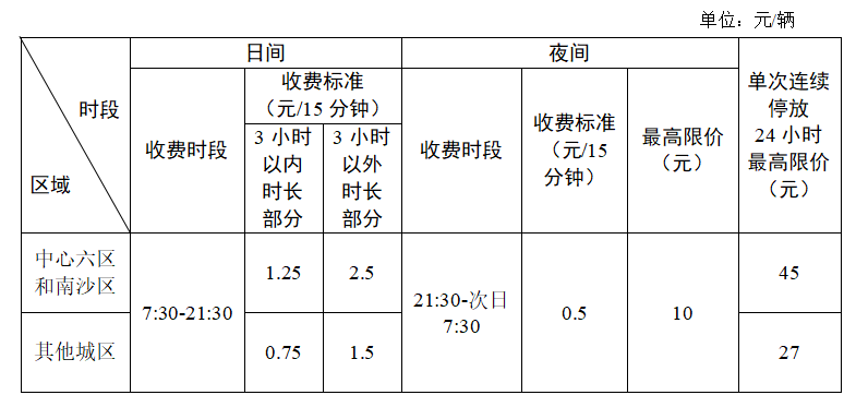 (一)以15分钟作为计费单位,计费时段中不足15分钟的部分按15分钟计算,并设定单次连续停放24小时最高限价。针对跨时段的计费单位,按照该计费单位所跨两个时段中收费较低的标准执行。