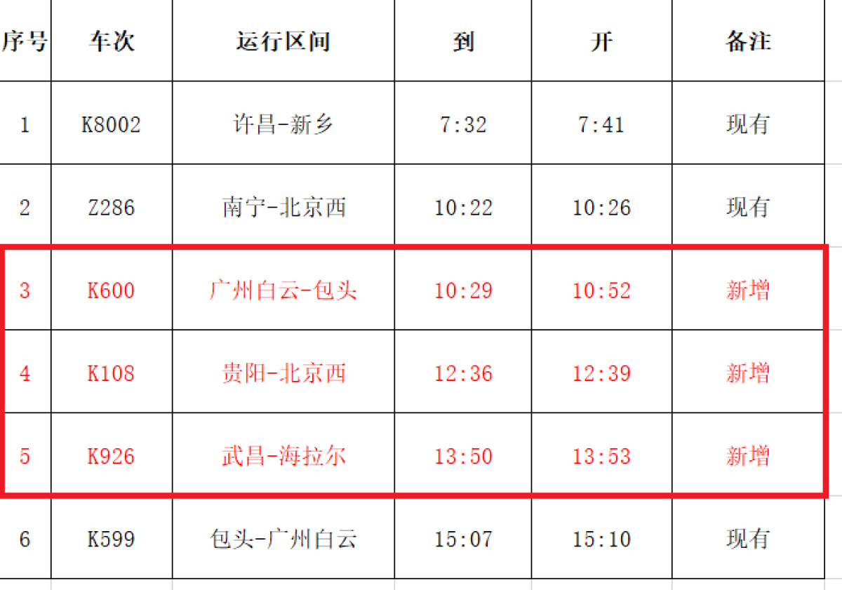 据悉,此次新增的3趟列车分别为:广州白云-包头的K600次列车、贵阳-北京西的K108次列车、武昌-海拉尔的K926次列车。记者在12306APP上查询发现,K600次列车为K599次的返程车次,其在河南省内停靠多个站点。12月21日,大河报·豫视频实地探访恢复客运一个月的新郑站时,有乘客表示,希望增加往返郑州的车次,如今新郑站即将增加三趟旅客列车,省内多地的居民往返新郑更加方便了。