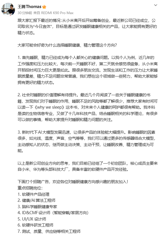 【大河财立方消息】1月8日,王腾通过微博发文称,从小米离开后开始筹备创业,最近新公司已经成立,公司取名为“今日宜休”,目标是睡眠健康相关的产品。