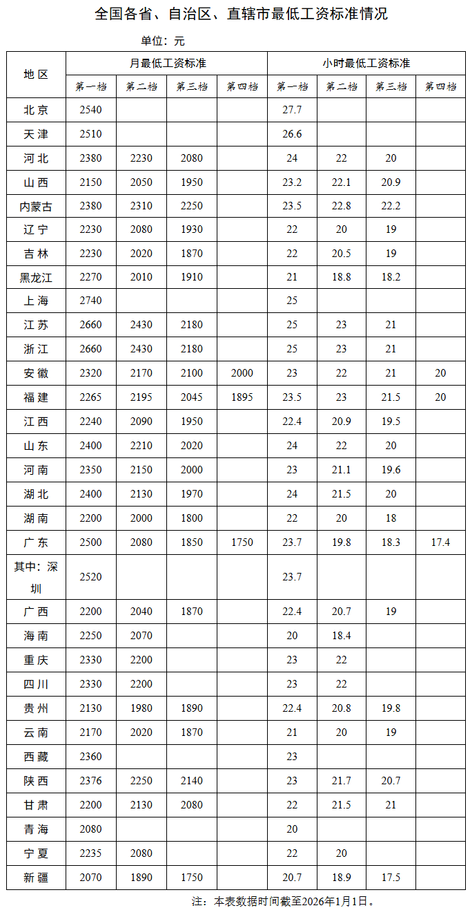 【大河财立方消息】 1月13日,人力资源和社会保障部公布全国各省、自治区、直辖市最低工资标准情况(截至2026年1月1日)。