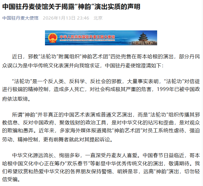 1月13日晚,中国驻丹麦使馆发布关于揭露“神韵”演出实质的声明——