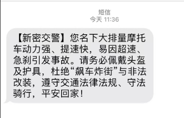 新密交警短信提醒:您名下大排量摩托车动力强、提速快,易因超速急刹引发事故。请务必佩戴头盔及护具,杜绝“飙车炸街”与非法改装……