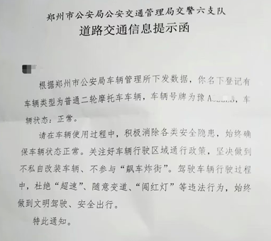 郑州交警六大队道路交通信息提示函显示:你名下登记有车辆类型为普通二轮摩托车车辆,请在车辆使用过程中,积极消除各类安全隐患,始终确保车辆状态正常。关注好车辆行驶区域通行政策,坚决做到不私自改装车辆、不参与“飙车炸街”……