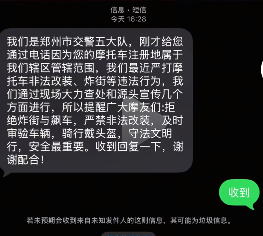 郑州交警五大队短信提醒:我们最近严打摩托车非法改装、“飙车炸街”等违法行为,提醒广大摩友们守法文明出行……