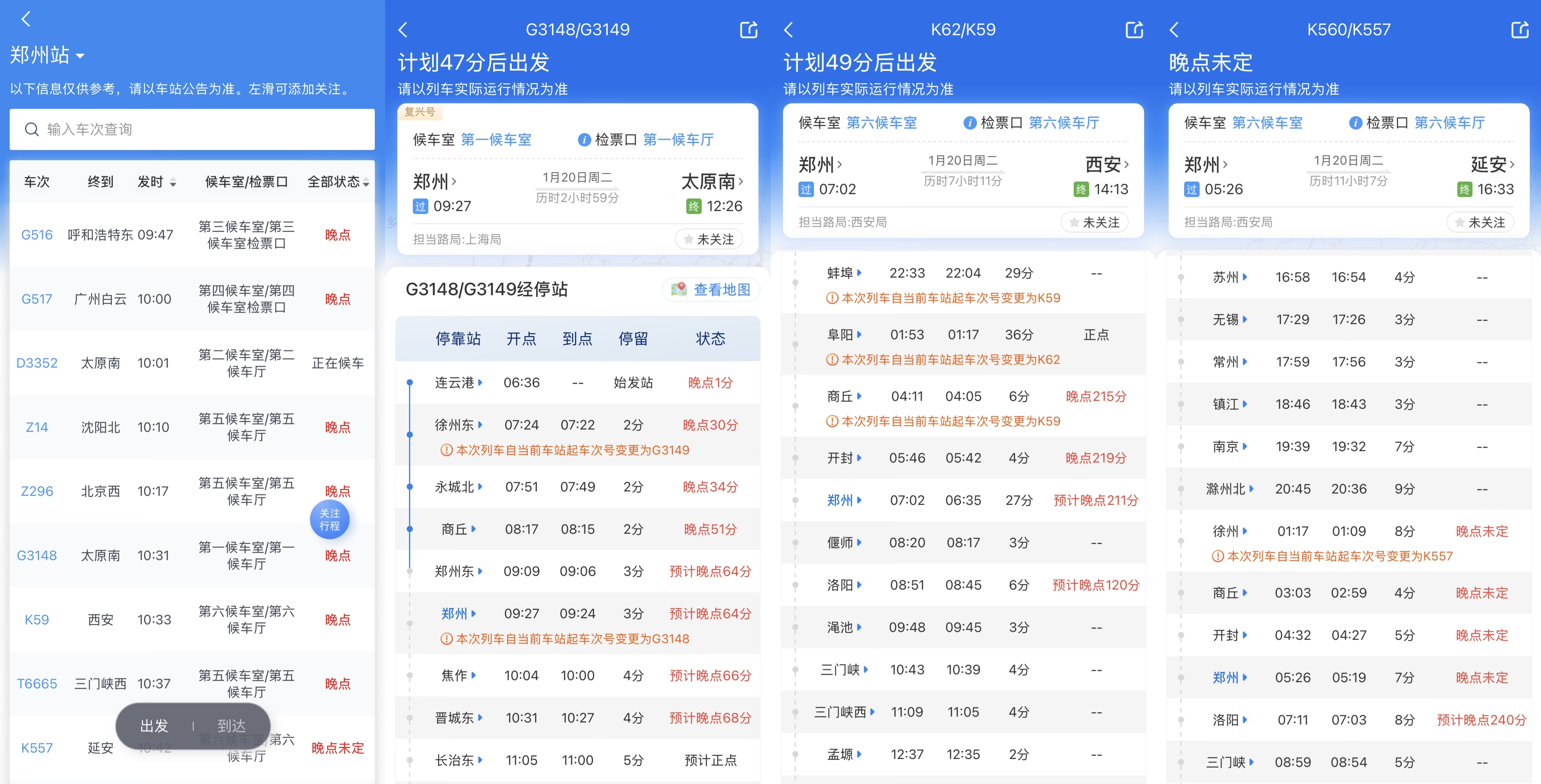 1月20日上午9时30分,记者在12306App上看到,多趟途径郑州站及郑州东站的列车处于晚点状态,晚点时间一个小时到4个小时不等。