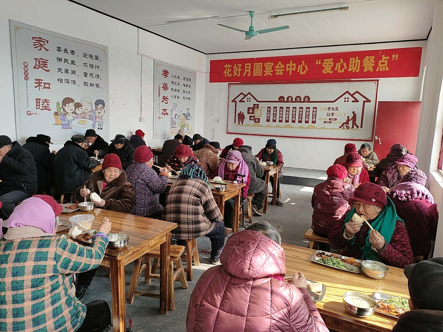 爱心传递温暖,责任彰显担当。花好月圆宴会中心主动扛起社会责任,依托专业餐饮优势,精心搭配适合老年人的清淡、营养、易消化的菜品,严格把控食品安全,用实际行动助力乡村助老事业,为全乡爱心助老工作树立了良好标杆。村“两委”全程统筹协调,细致摸排每一位高龄老人的身体状况和饮食需求,不断优化就餐流程、完善场地保障,全力推动这项民生工程落地见效、惠及民生。志愿者们主动请缨、无私奉献,穿梭在食堂各个角落,为行动不便的老人端菜、盛饭、擦桌子,耐心询问老人的口味偏好,用点滴付出为老人们送去陪伴与温暖,他们的善意与热忱,值得每一个人点赞与弘扬。