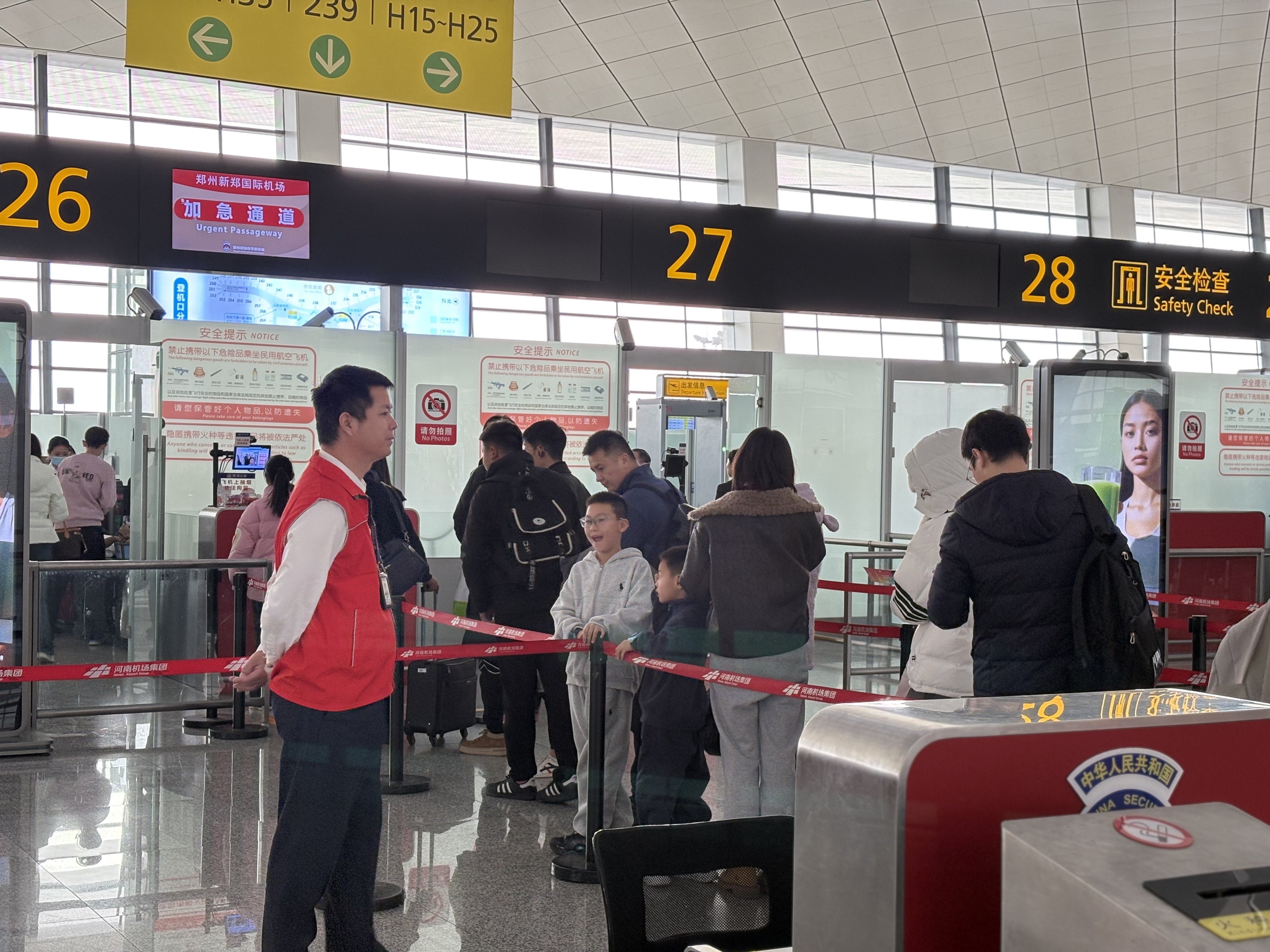 办完了值机手续、托运完行李之后,旅客就有序来到郑州机场安检区,各安检通道的小团队,为旅客提供安检服务,从9点半到11点,15时到16时,安检区的客流高峰一个接着一个,晚到的旅客,有应急通道,陪伴老人、带着小孩的旅客,有爱心通道,不能带上飞机的物品,安检人员解释得清清楚楚。