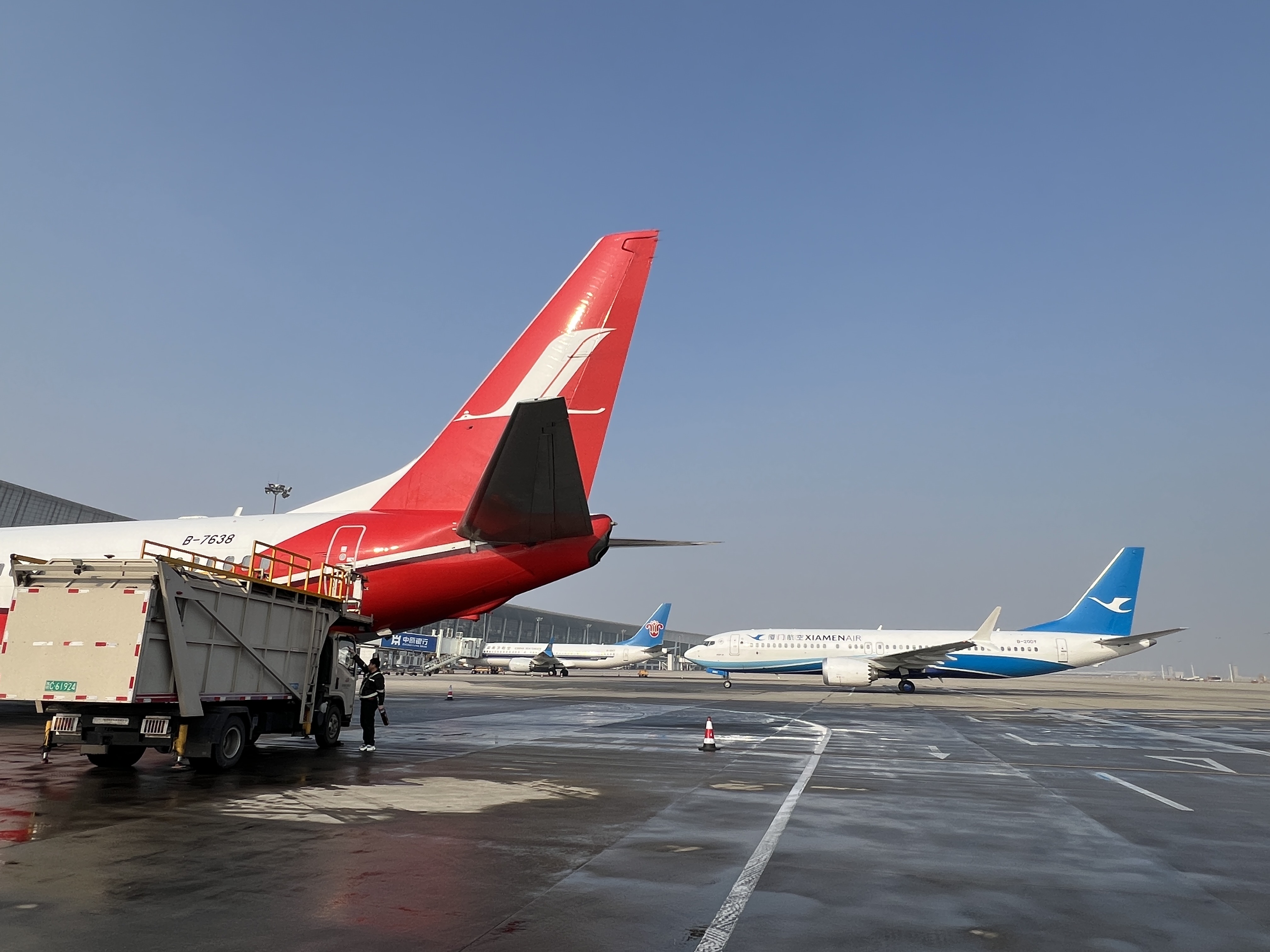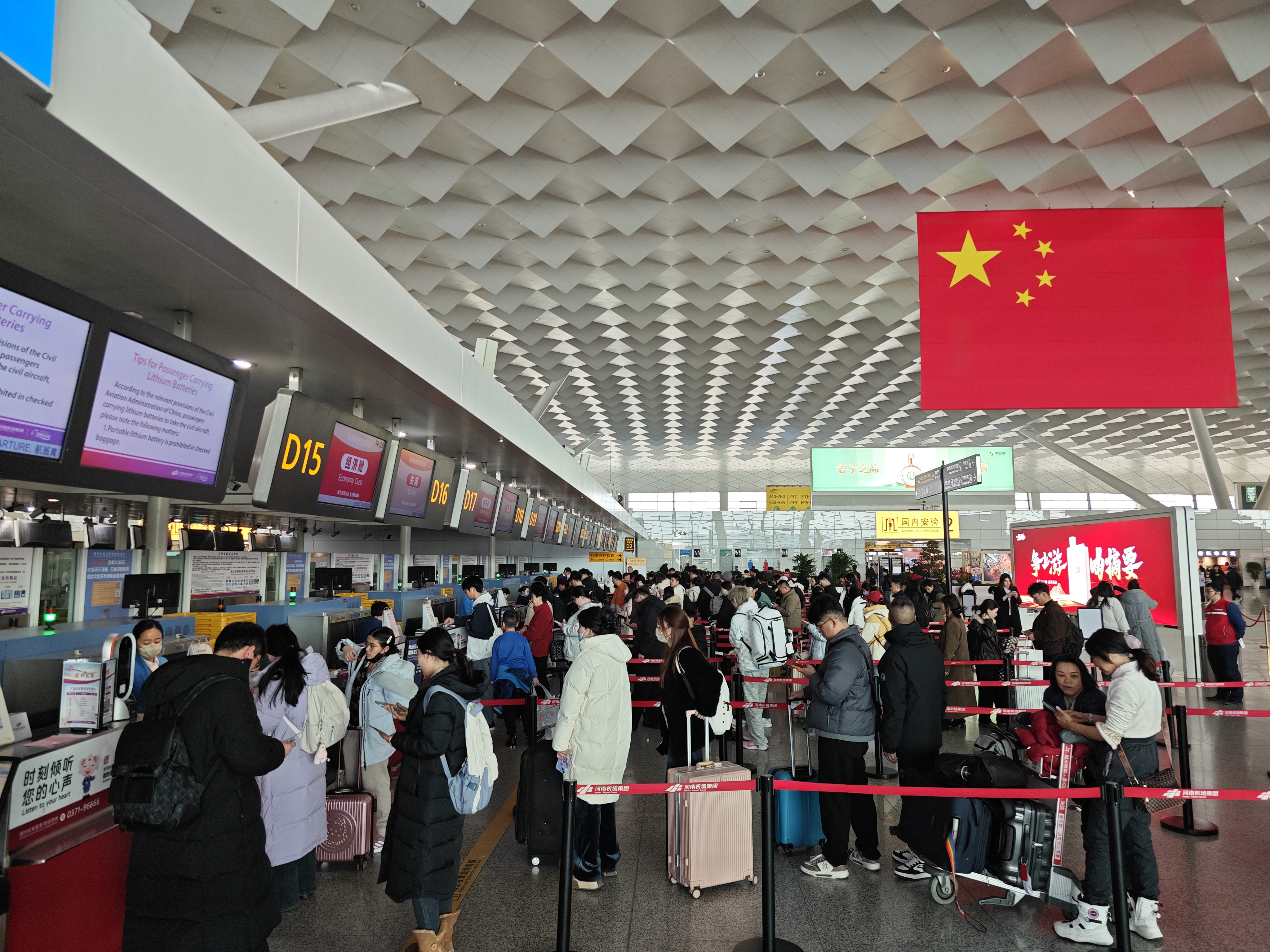 根据郑州机场的航班计划,郑州机场春运首日航班计划为681架次,比春运开始前的2月1日净增加将近50架次,这个航班的密度,在郑州机场T2航站楼的值机区和安检区最为明显,各值机区域的工作人员熟练地为旅客办理登机牌、托运行李等手续,位于四层出发厅的总服务台工作人员,解答着旅客关心的问题。郑州机场从17个保障单位的报名者中,选出了34名航空出行业务骨干组成了郑州机场“我帮您”服务团队,主要在三个地方提供服务:一个是四层出发厅的中心问询台,一个是安检待检区,另一个是二层国内到达口。如果在楼内遇到有穿红马甲的员工,乘客尽管问询,他们会随时停下来为旅客提供服务。