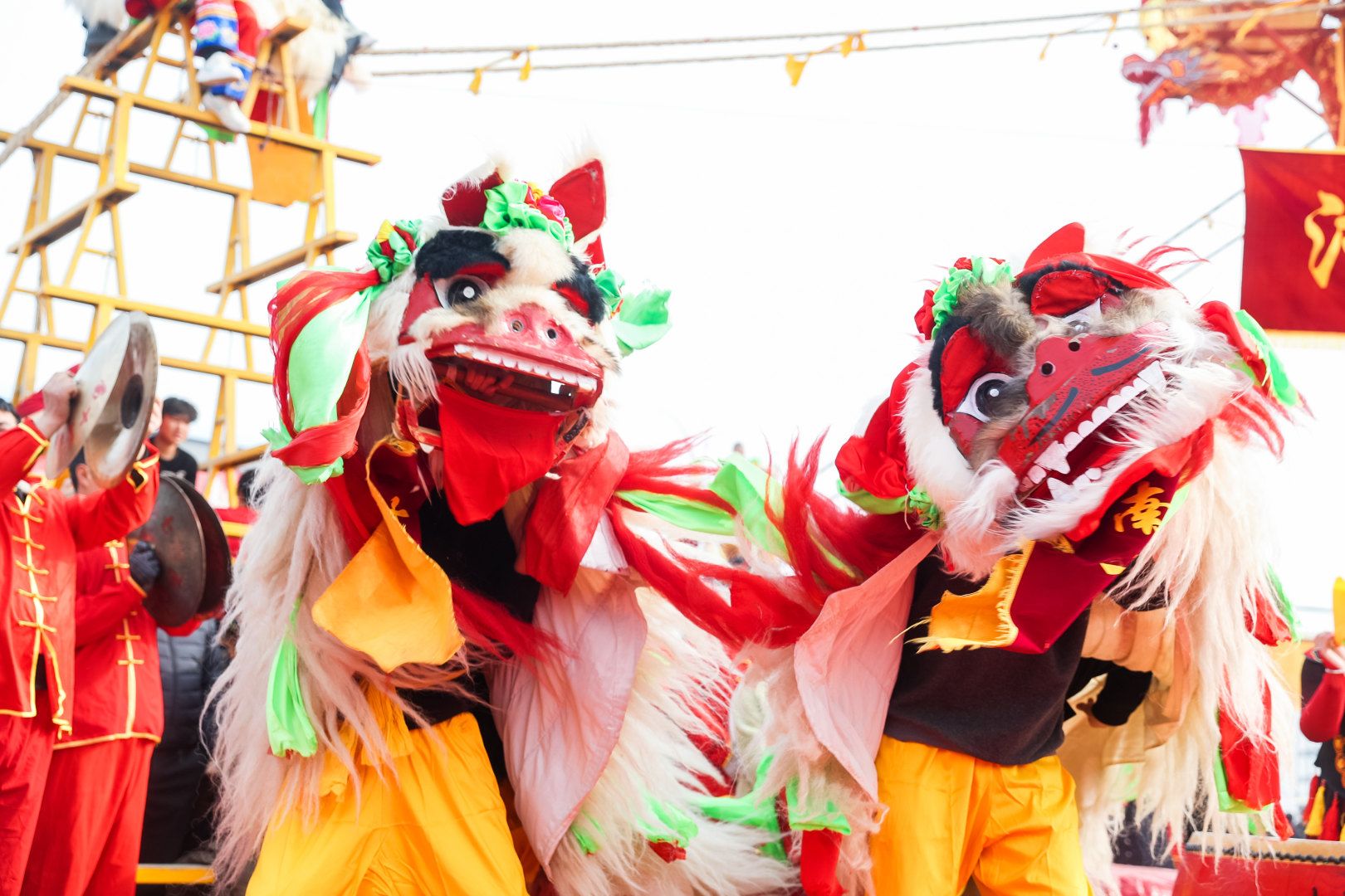 随后,大型高空表演“五子登科九狮闹春狮王争霸”精彩上演。舞狮灵动腾跃,翻滚自如,引得现场掌声与喝彩声不断。