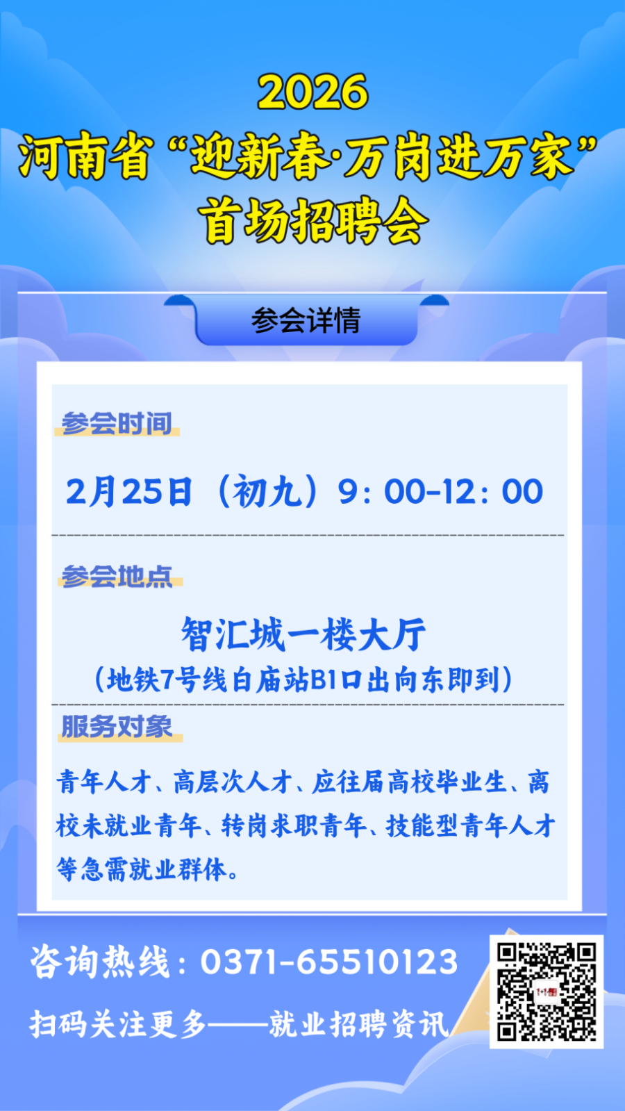 正月初九(2月25日)上午,2026河南省“迎新春·万岗进万家”首场招聘会将在智汇城一楼大厅举办。2月23日,记者从郑州市金水区人力资源和社会保障局获得此消息。