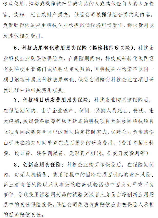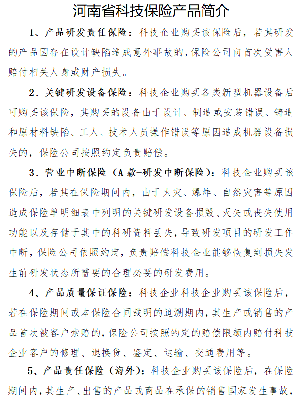 通知称,此次申报对象为投保8个险种的郑州市高新技术企业和科技型中小企业,包括产品研发责任保险、关键研发设备保险、营业中断保险(A款-研发中断保险)、产品质量保证保险、产品责任保险(海外)、科技成果转化费用损失保险(揭榜挂帅攻关险)、科研费用损失保险、创新应用责任险(包含无人机、药械临床试验等)等险种,险种名称不同但具体条款实质相同的,可纳入补贴范围。