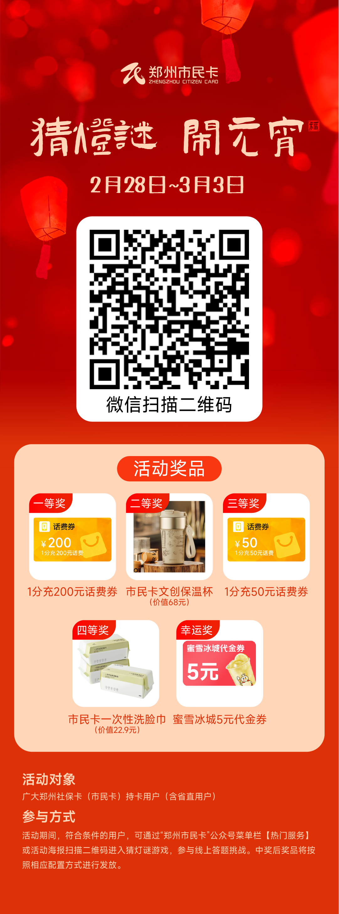 作为陪伴市民日常生活的贴心伙伴,郑州社保卡(市民卡)以传统民俗为纽带,将社保温情融入节日欢乐,陪伴大家喜乐闹元宵。期待广大市民在猜灯谜、赢好礼的过程中,品味传统韵味,学习社保知识,收获满满的节日喜悦。