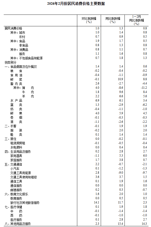 【大河财立方消息】 3月9日,国家统计局数据显示,2026年2月份,全国居民消费价格同比上涨1.3%。其中,城市上涨1.4%,农村上涨0.9%;食品价格上涨1.7%,非食品价格上涨1.3%;消费品价格上涨1.1%,服务价格上涨1.6%。1—2月平均,全国居民消费价格比上年同期上涨0.8%。