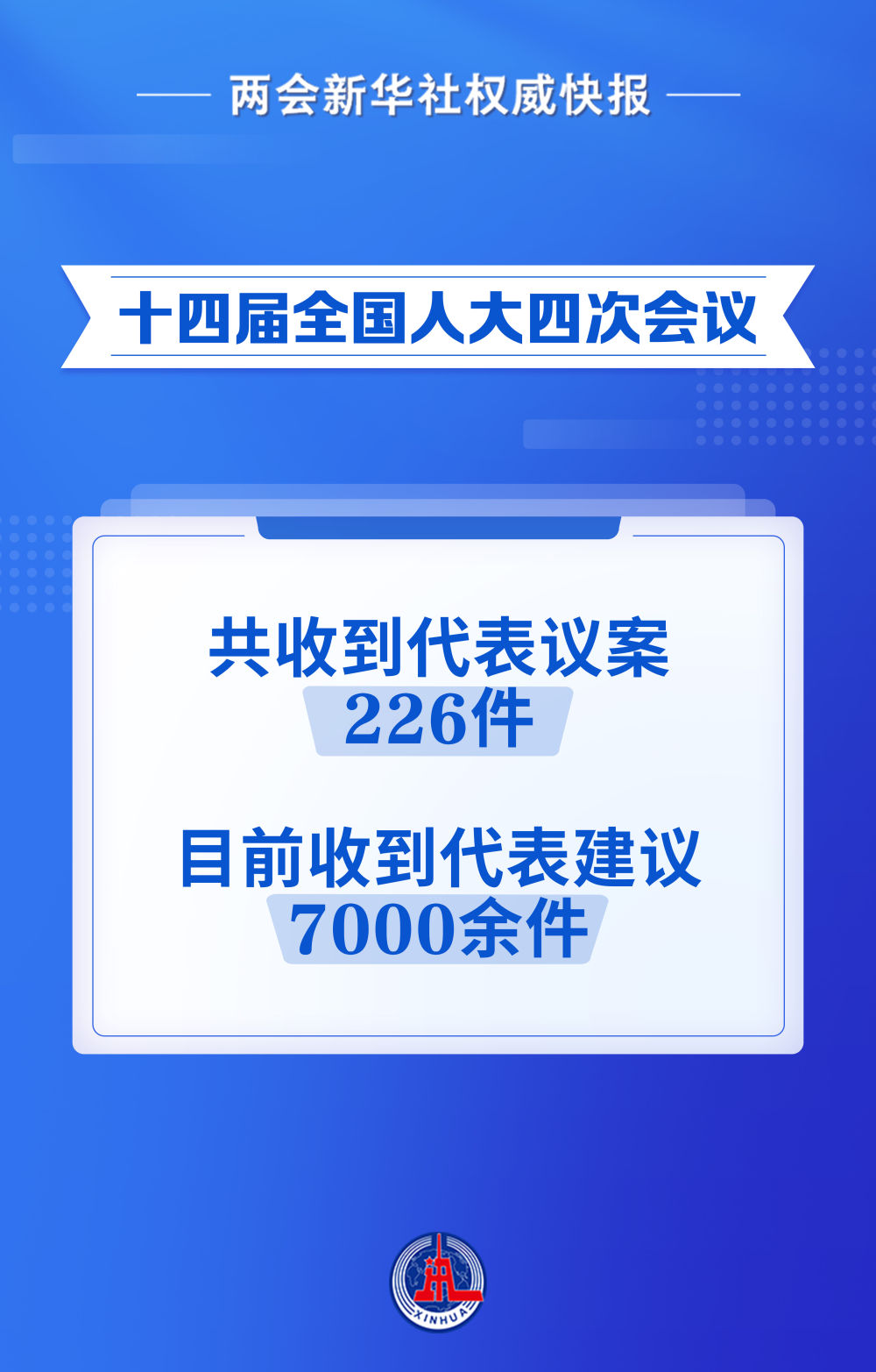 根据十四届全国人大四次会议主席团决定的代表提出议案的截止时间,到3月8日12时,十四届全国人大四次会议秘书处共收到代表议案226件。此外,目前大会秘书处已收到代表建议7000余件。 【责任编辑:牛尚 】 【内容审核:靳静波 】 【总编辑:黄念念 】 关注河南一百度了解更多本地资讯