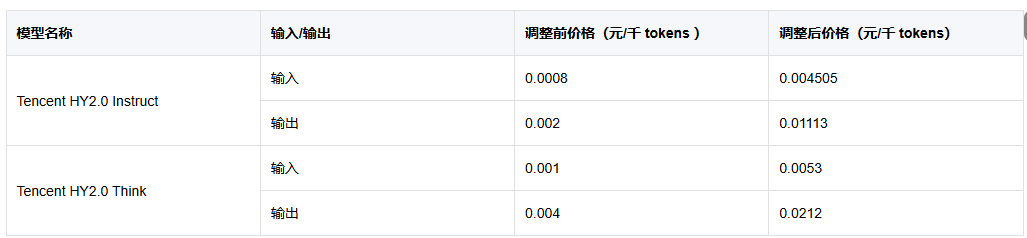具体看,Tencent HY2.0Instruct输入价格从每千tokens0.0008元调整为0.004505元,涨幅高达463.13%;输出价格也从0.002元拉升至0.01113元,涨幅超过456% 。Tencent HY2.0 Think的输入输出价格也涨了近5倍。套餐订阅用户可通过套餐抵扣部分费用。