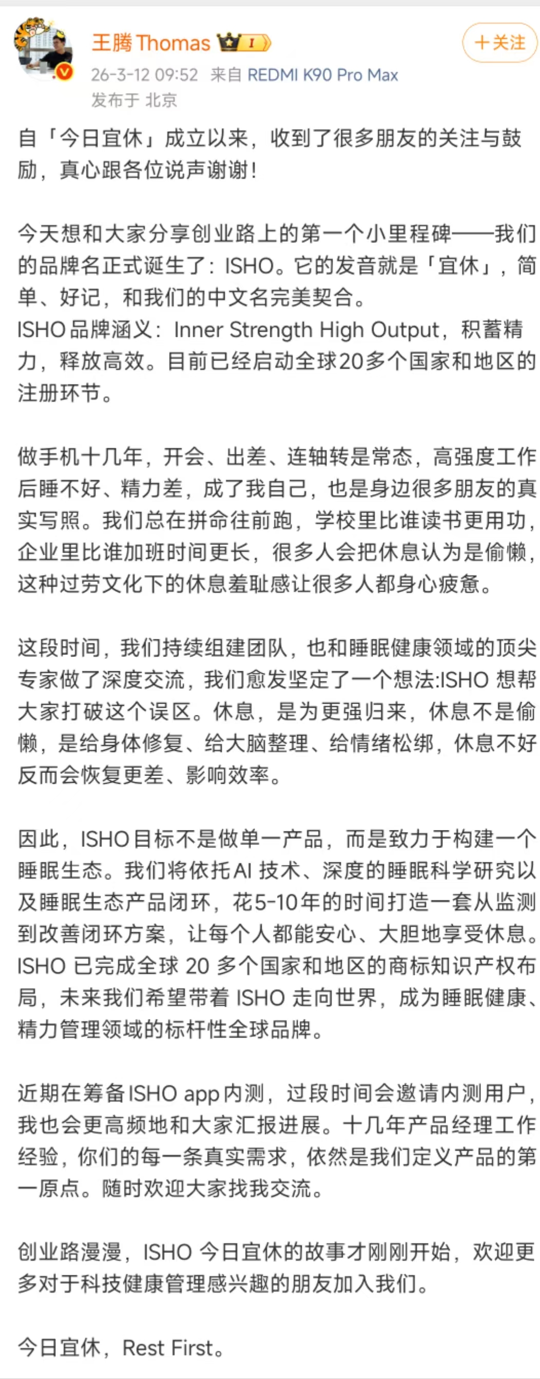 【大河财立方消息】 3月12日,小米前高管王腾发文宣布新公司“今日宜休”品牌名:ISHO,发音“宜休”,目前已启动全球20多个国家和地区的注册环节。他还透露,近期在筹备ISHO App内测,过段时间会邀请内测用户。
