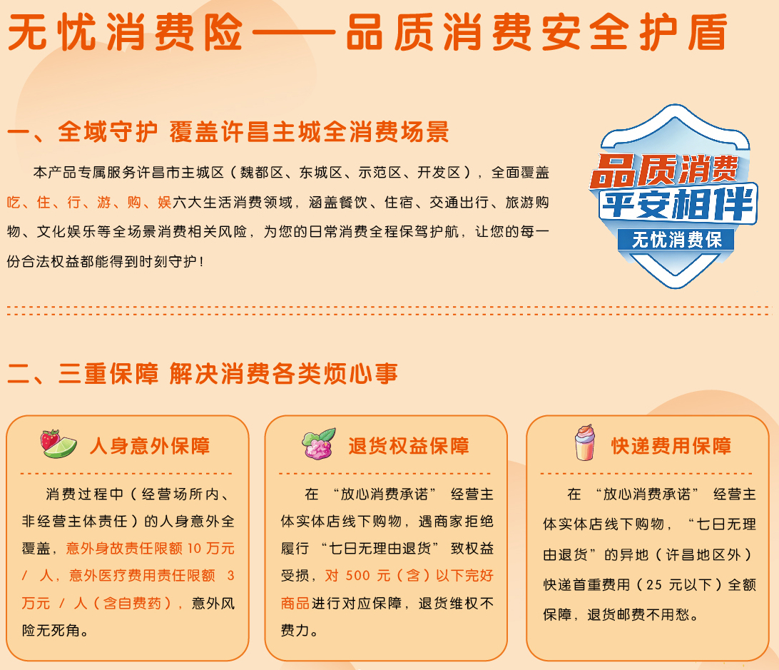 “无忧消费险”涵盖许昌市主城区(魏都区、示范区、开发区、东城区)的“吃”“住”“行”“游”“购”“娱”等生活消费领域。商家自愿作出“放心消费承诺”并成为“放心消费承诺经营主体”后,纳入七日无理由退货、异地退换货(首重免费)保障范围。