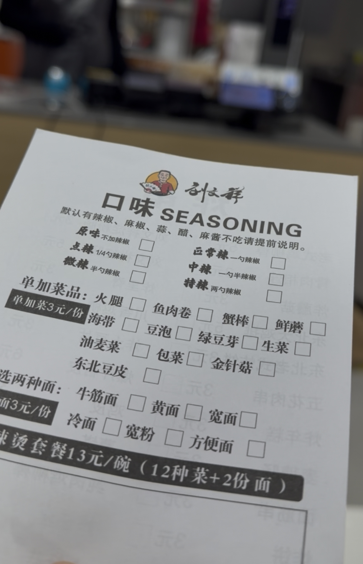 进入店内后记者发现,原本设置在进门处的自选菜品专柜已经关闭,透过玻璃可以看到一些冷冻食材整齐摆放在里面。店员引导顾客在一张纸质点单上勾选菜品,并表示目前店内只提供一款“大碗麻辣烫”。