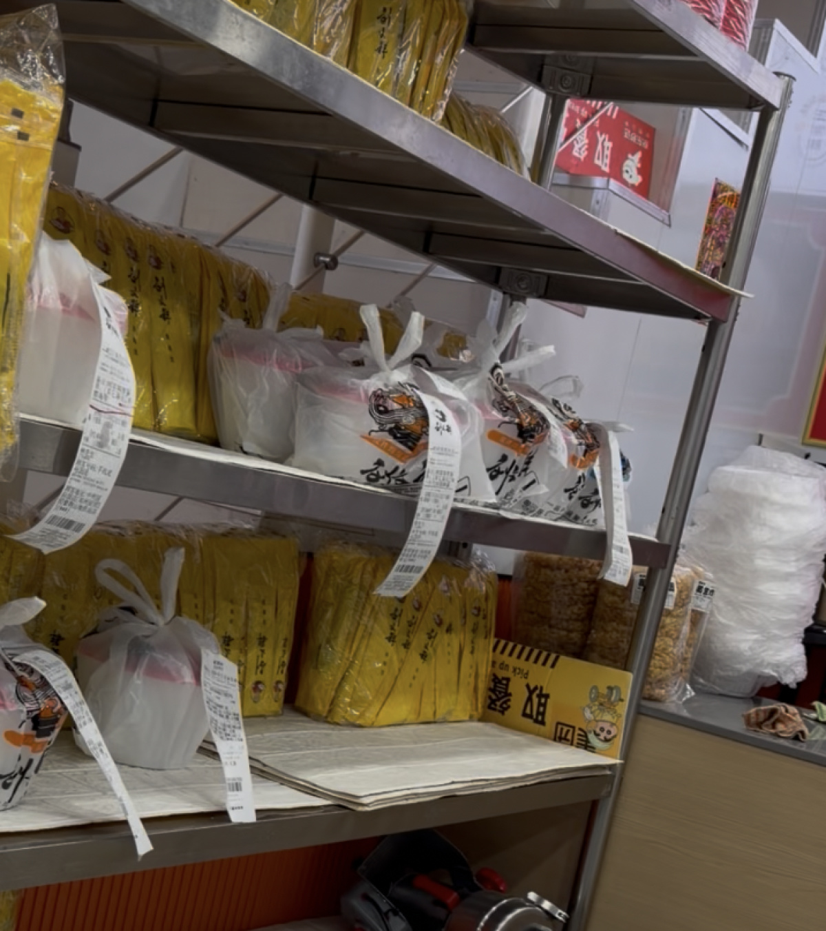 在店内观察期间,记者看到外卖架上摆放着不少等待骑手取走的订单。附近商户告诉记者:“被曝光后不知道影响大不大,不过骑手还是一直在进进出出。”