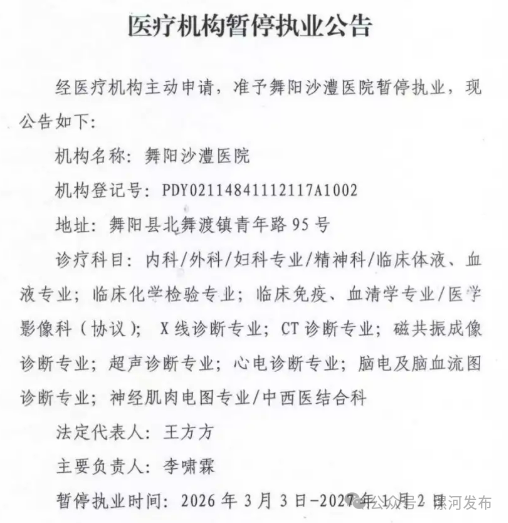3月18日,舞阳县卫生健康委发布《医疗机构暂停执业公告》,经医疗机构主动申请,准予舞阳沙澧医院暂停执业。