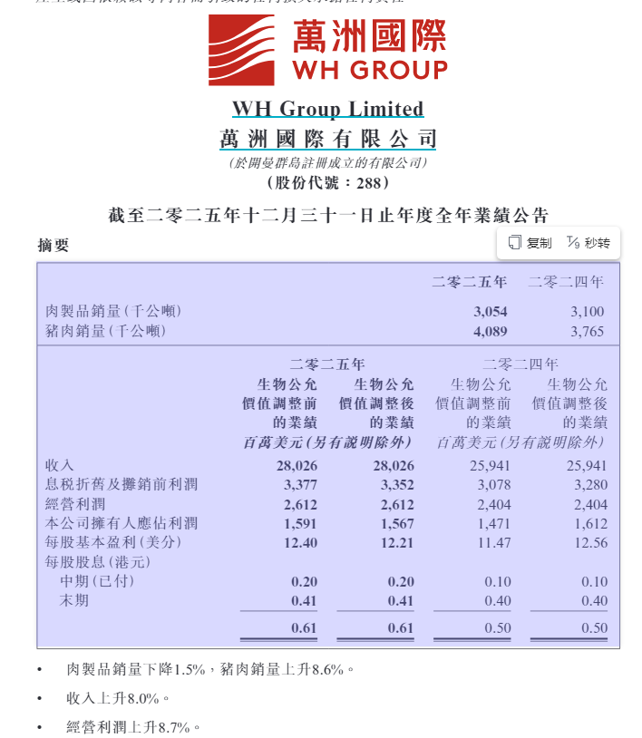 【大河财立方消息】3月24日,万洲国际披露2025年业绩。