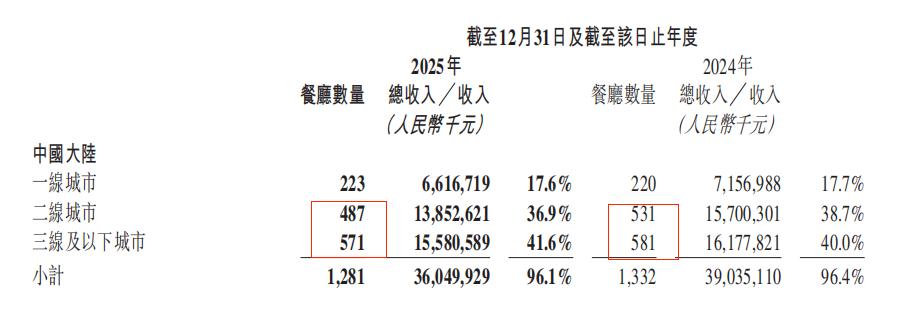 海底捞品牌门店结构,在2025年进行了新一轮调整,自营门店收缩,加盟店数量增加。2024年3月,海底捞正式推行加盟特许经营模式;截至2025年底,海底捞加盟餐厅增长至79家,年内新开21家,年内自营餐厅转加盟45家。报告期内,另有85家自营餐厅因经营表现未达预期主动关停或因商业地标迁移或设施老旧而搬迁,自营门店净减少51家,且减少门店均位于二三线及以下城市。