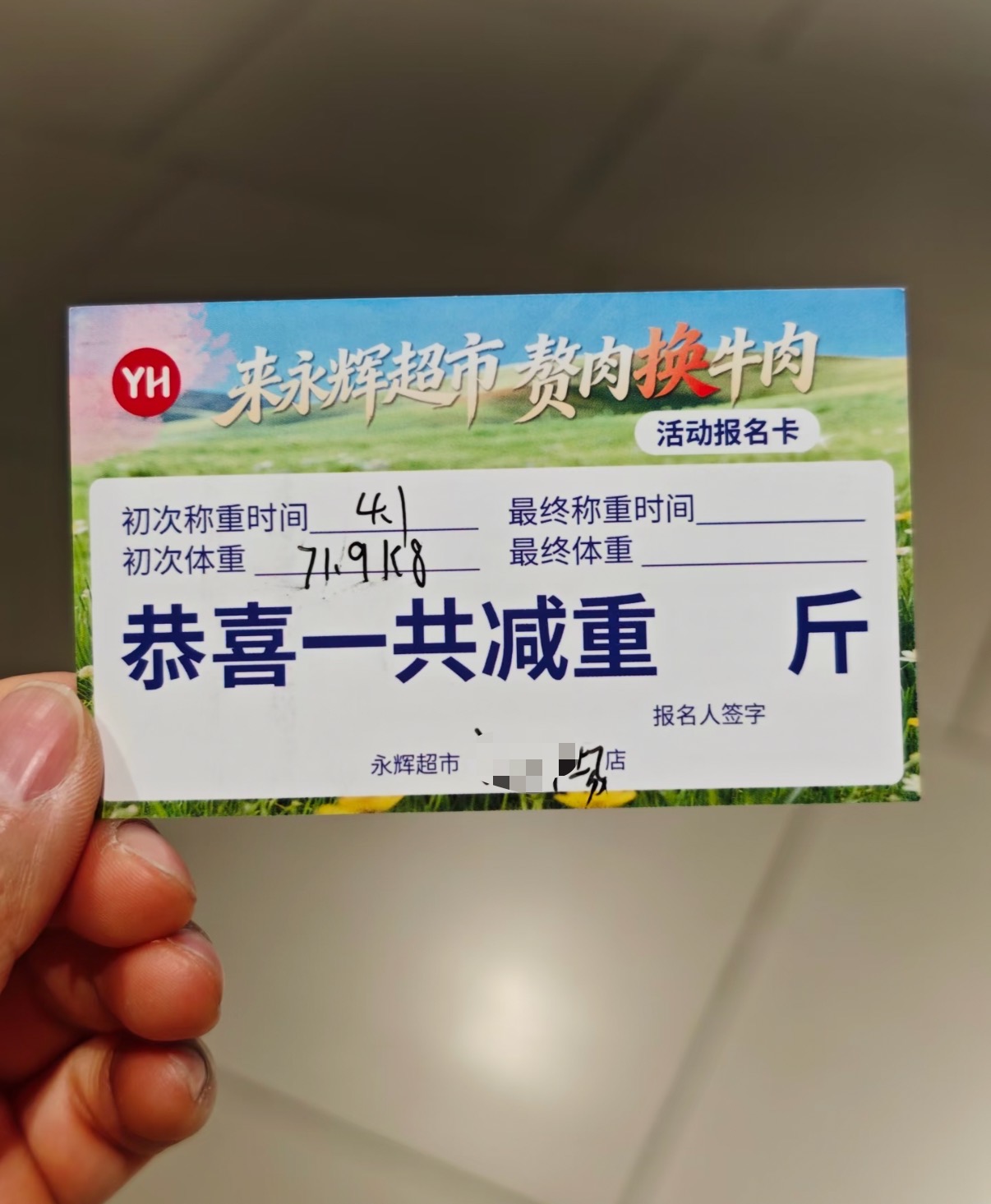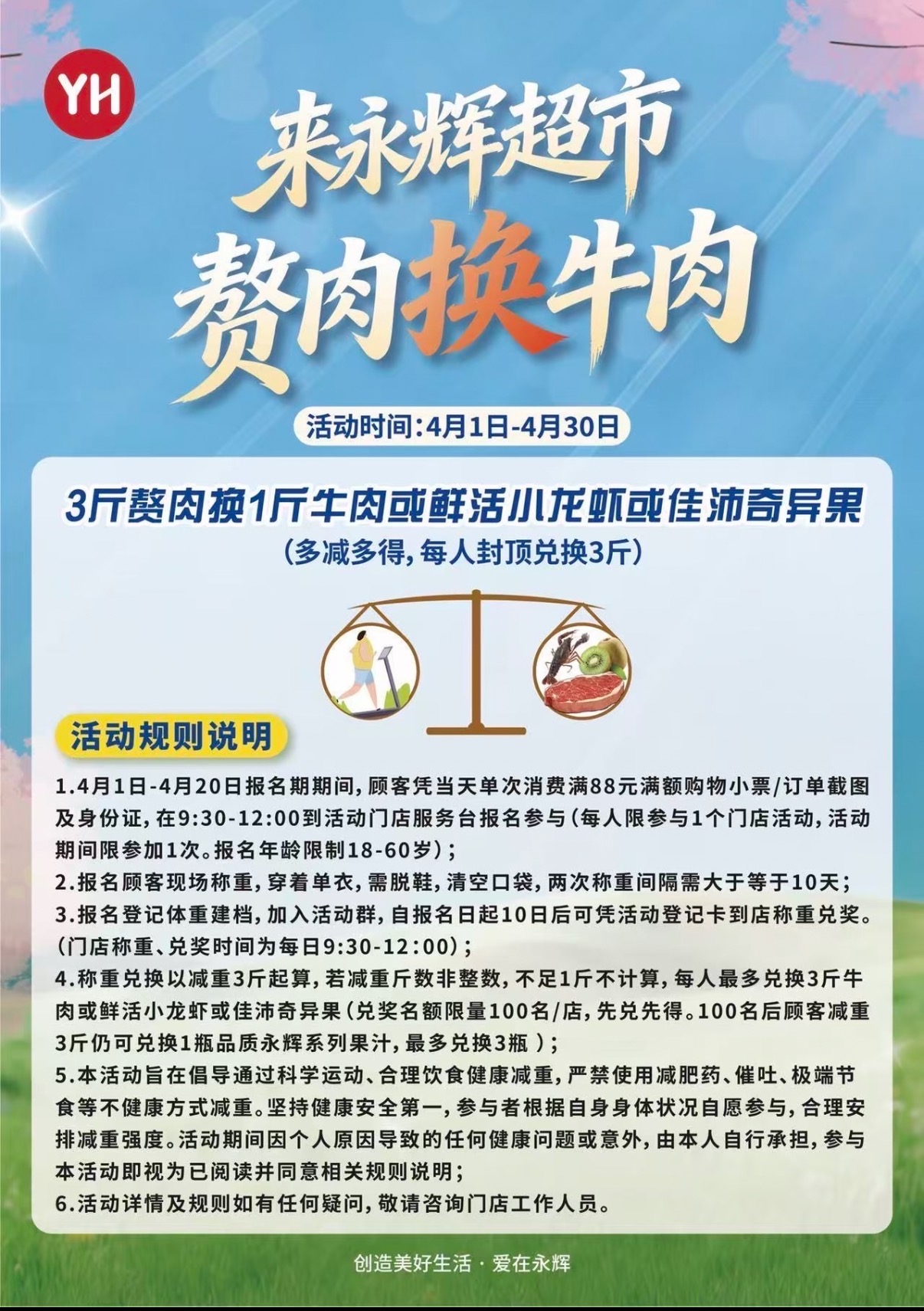 该工作人员介绍,活动报名时间为4月1日—4月20日,顾客凭当天单次消费满88元满额购物小票或订单截图及身份证,每天上午9:30—12:00到活动门店服务台报名参与,报名年龄限制在18岁至60岁。4月10日—30日为称重兑换期,参与者每成功减重3斤,即可兑换1斤牛肉或小龙虾,每人最高可兑换3斤。